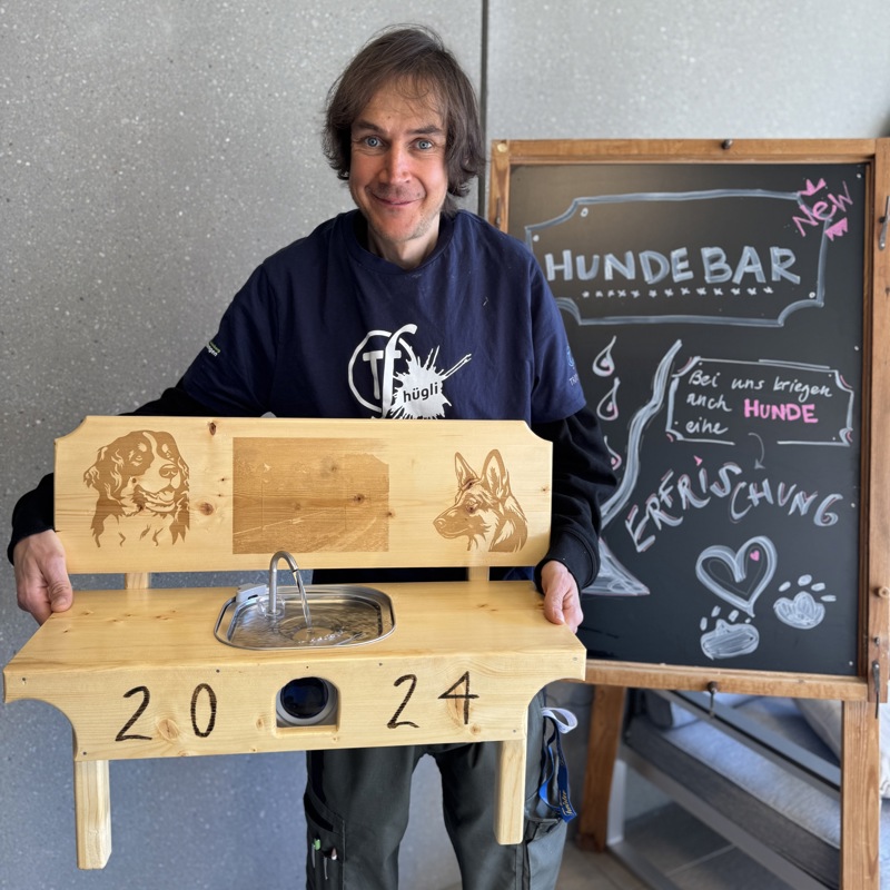 Bei uns sollen sich auch vierbeinige Gäste wohlfühlen. Darum gibt es auf der Terrasse im Restaurant fairpflegig in Steffisburg neu eine Hundebar: ein Unikat – gebaut von unserem Mitarbeiter Andreas, aus Tannenholz aus seinem Waldstück.
